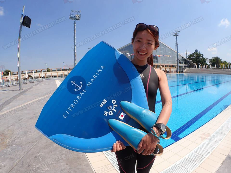 Thanks to the monofin’s wing it is positively buoyant at the surface enabling the freediver to rest comfortably in between dives. Buoyancy turns negative at a depth of 5-10m.